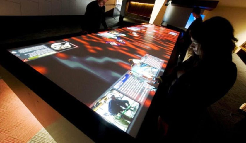 桌面互动投影:能够让原本静态的桌面“活”起来,让人们体验到不一样的投影乐趣。只要在桌面轻轻的点一下就能够出现视频、图片等咨询,是一种较为先进的信息展示方式。