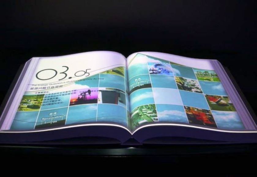 虚拟翻书:虚拟翻书,多媒体行业称之为电子翻书、又称为“空中翻书”。是展馆里最常见的多媒体展项之一,通过软件技术把图、文、视频等集成在一个文件中安装在一体机或投影在书模上,通过手势或触摸达成翻书效果。